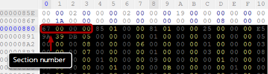 Note the section size (AF 00 00 00 as hexadecimal, or 175 as decimal). If you use the hex value, you have to swap/reverse the byte order. It means that AF 00 00 00 backwards, becomes 00 00 00 AF, and you can remove the leading zeros so that you have just AF in the end.