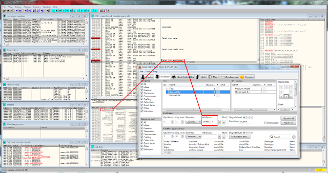 In this screenshot, I've set a few breakpoints where the game reads inventory items. There was actually a lot of pre-work before I even knew that the game read items here. I won't go too much into that but it's tedious work. :)