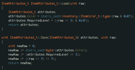 You can see Color and RequiredLevel here, which are extracted from the raw attributes value. For now, those two are the only values I can really make sense of right now.