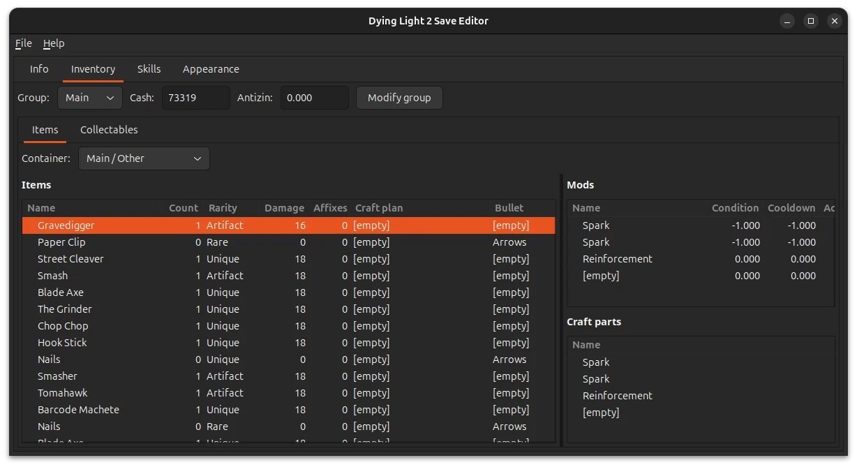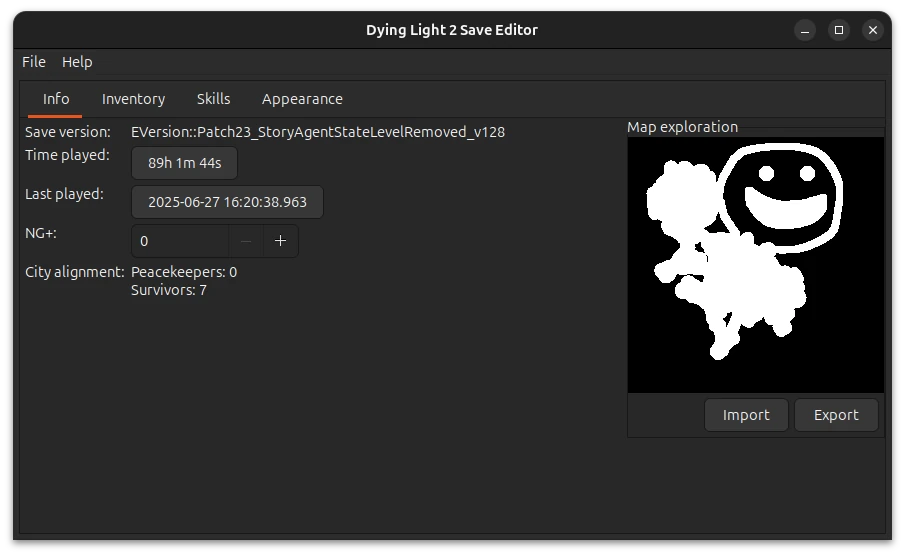 Free, cross-platform Dying Light The Beast game save editor. Edit your inventory, skills, map fog, unlock collectibles, outfits and more.