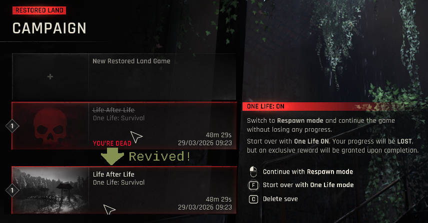 With One Life (permadeath) active, you can revive yourself and keep playing.